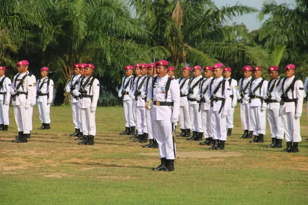 TNI AL. Kormar.Brigif 4 Marinir. Yonif 9 Marinir. Dalam rangka menyambut HUT Korps Marinir ke 79 prajurit Yonif 9 Marinir laksanakan latihan Upacara dan Defile di Ksatrian Yonif 9 Marinir, Batumenyan, Teluk Pandan, Pesawaran Lampung. Jumat (08/11/24).